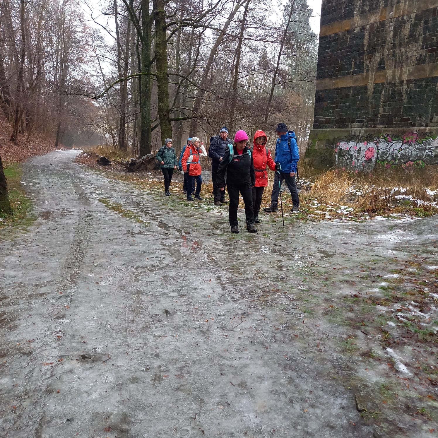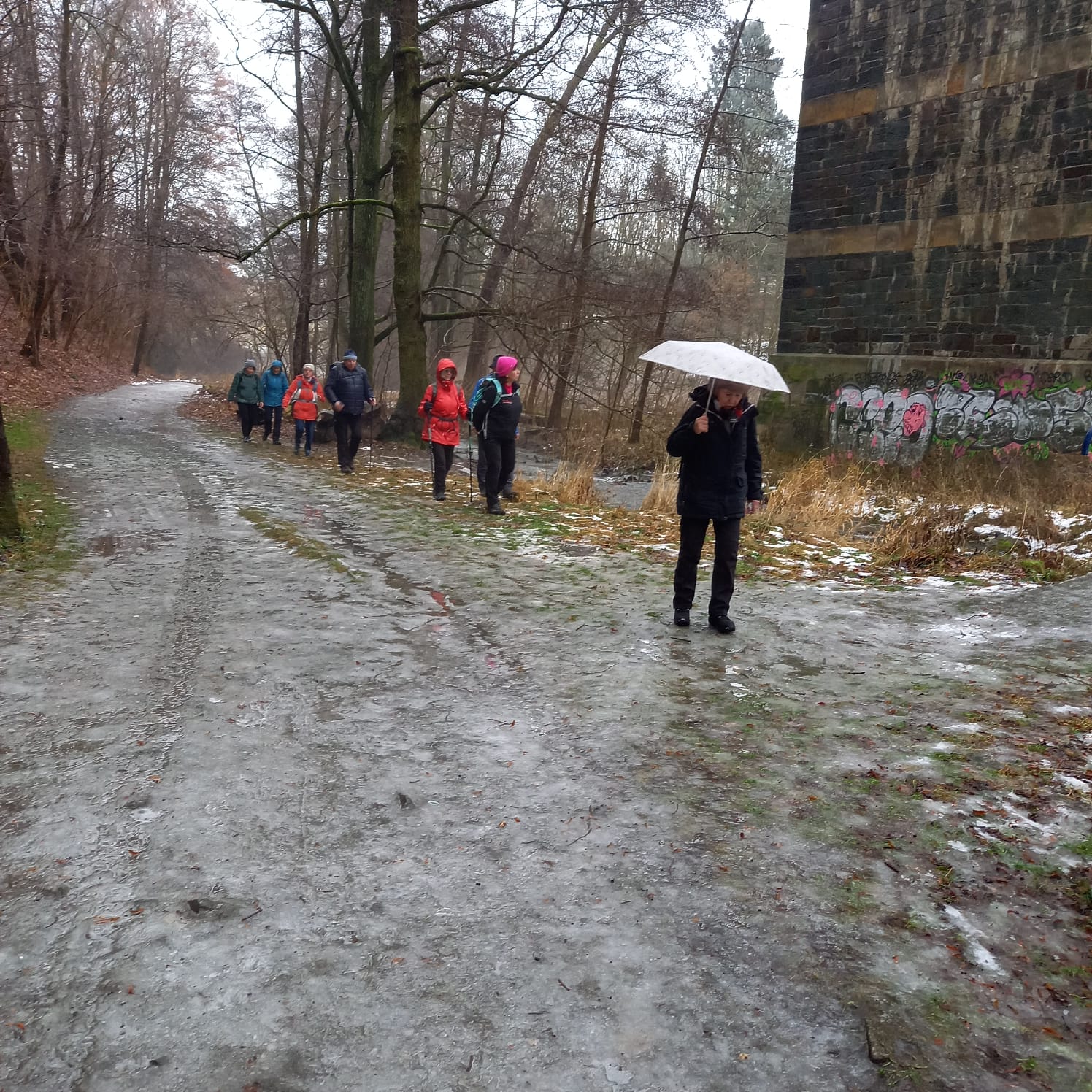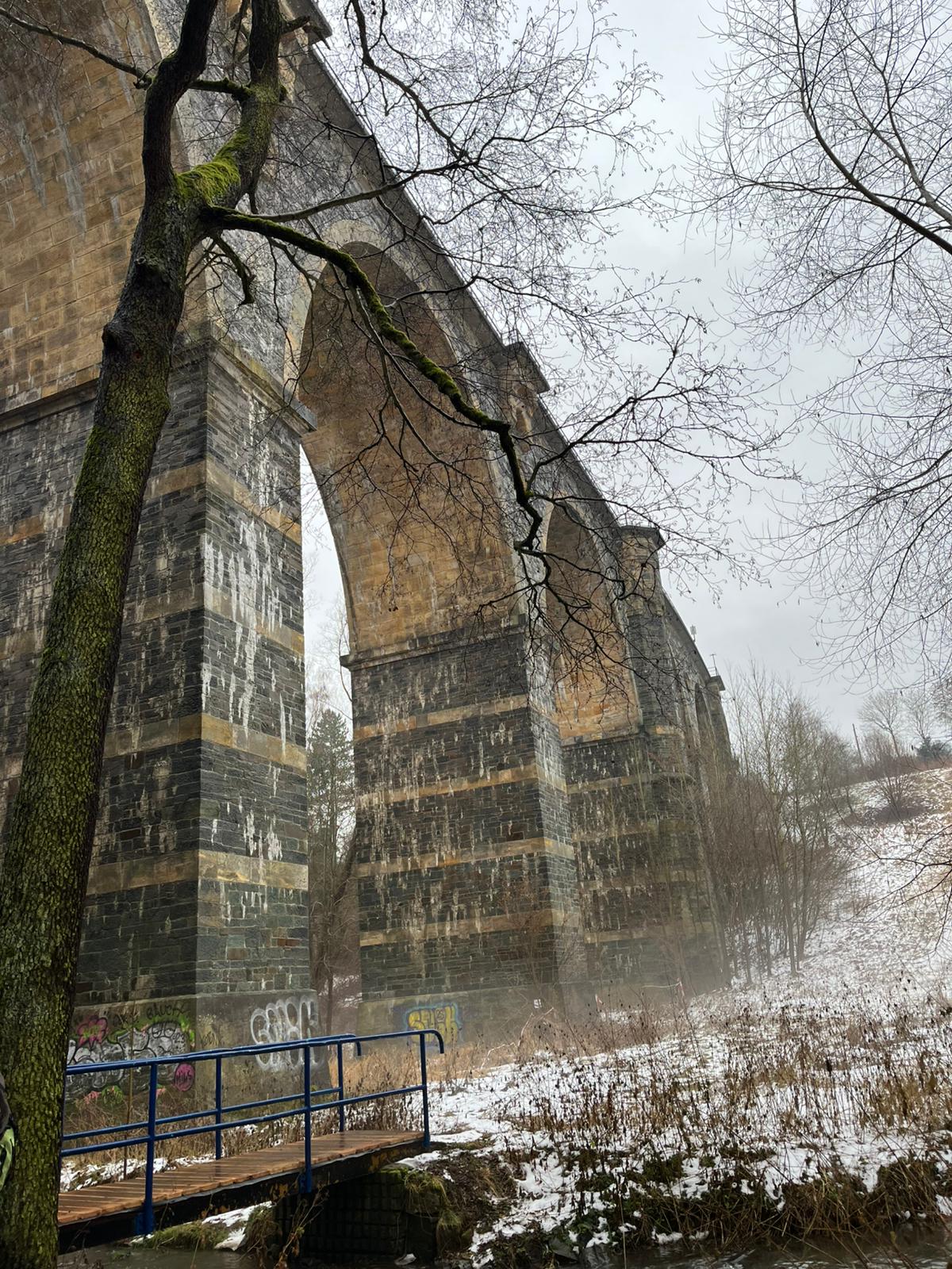Gleich zu Beginn wird es von der imposanten 201m langen und 34m hohen Syratalbrücke mit 11 Steinbögen überspannt. Dieses Landschaftsschutzgebiet wird von den Plauenern für ausgedehnte Spaziergänge intensiv genutzt, wie am Sonntag vor unserer Wanderung, als es – wie auch die angrenzenden Wiesen und Hänge – unter einer geschlossenen Schneedecke lag. Viele Fußgänger und Kinder mit Schlitten nutzten den herrlichen Wintertag. Doch innerhalb von vier Tagen war durch einen Temperaturanstieg um etwa 15 Grad der Schnee getaut, außer dem festgetretenen auf dem Wanderweg, der sich in eine rutschige Fläche verwandelt hatte und die 17 Wandersperken zwang, auf Laub- und Grasränder auszuweichen, wodurch sich das Wandertempo etwa halbierte. Von der geplanten Wanderung auf üblichen Wegen musste deshalb zugunsten der sonst bei Wanderern verpönten Straße abgeändert werden. Von der Kauschwitzer Straße aus wanderten wir durch das Fuchsloch, ein Waldgebiet, das auch mit etlichen Stationen des Paul-Scholz-Lehrpfades den Wanderer auf Besonderheiten in der Natur aufmerksam macht. Die Eingangstafel des Lehrpfades steht nahe an der B92, von dort gelangten wir nach 8km über schmale Straßen und durch Gartenanlagen zur Gaststätte „Am Parktheater“, wo das Mittagessen bestellt war.