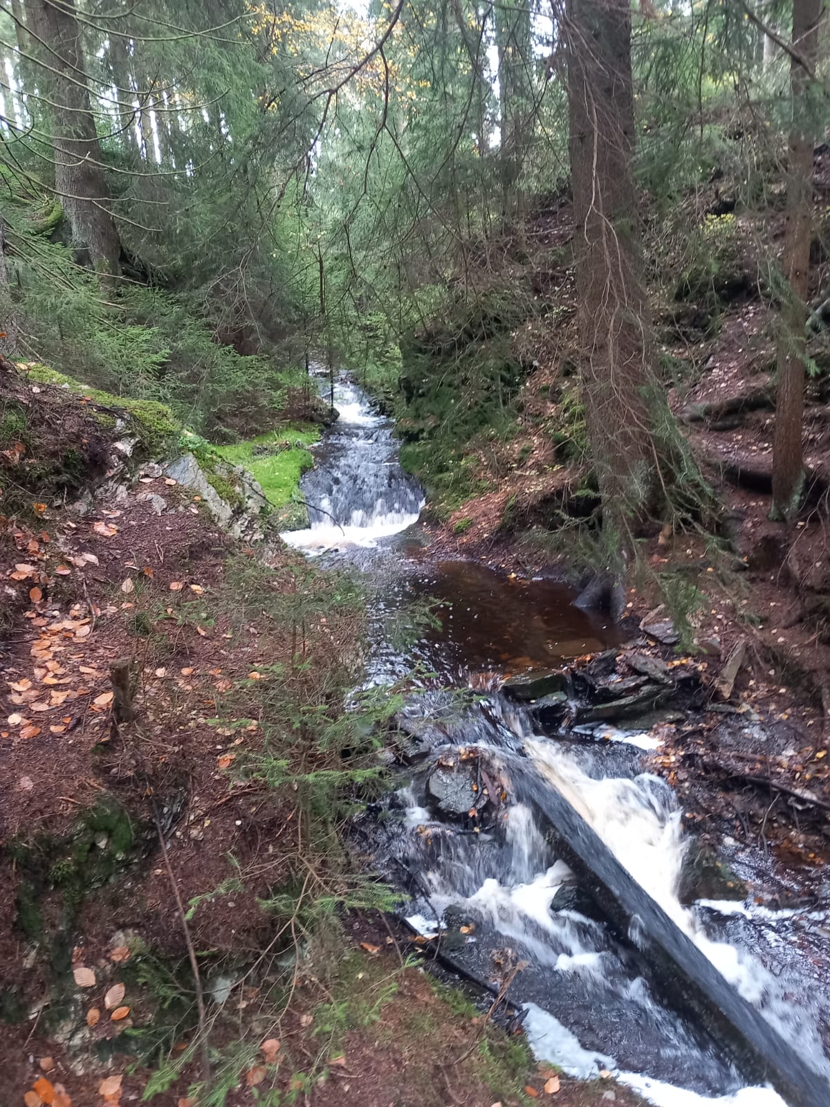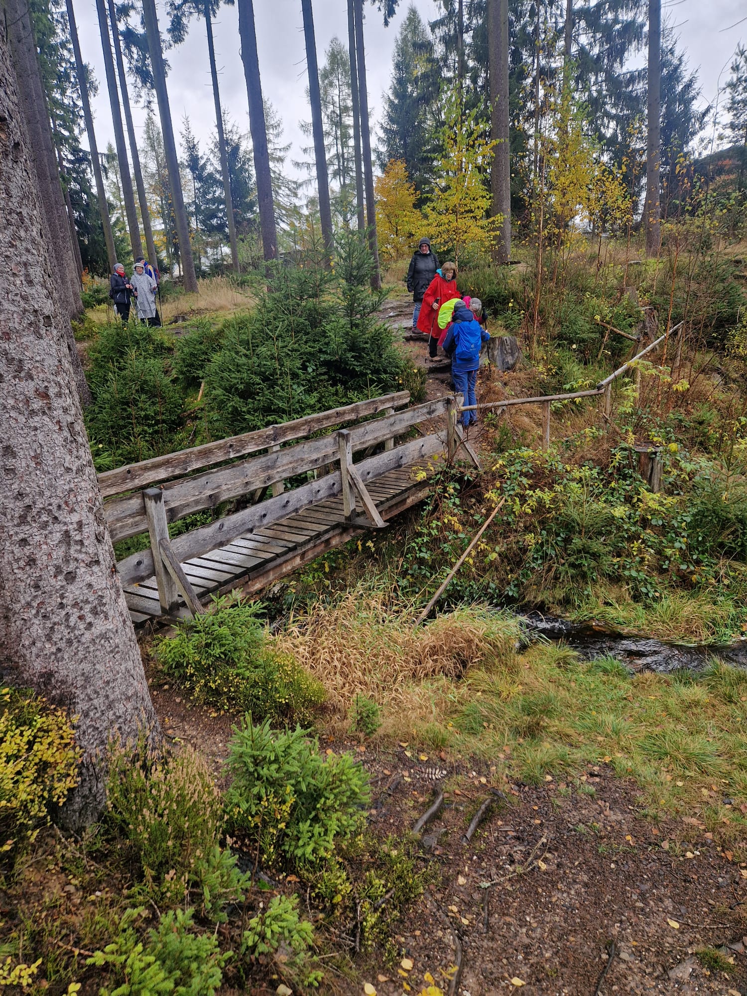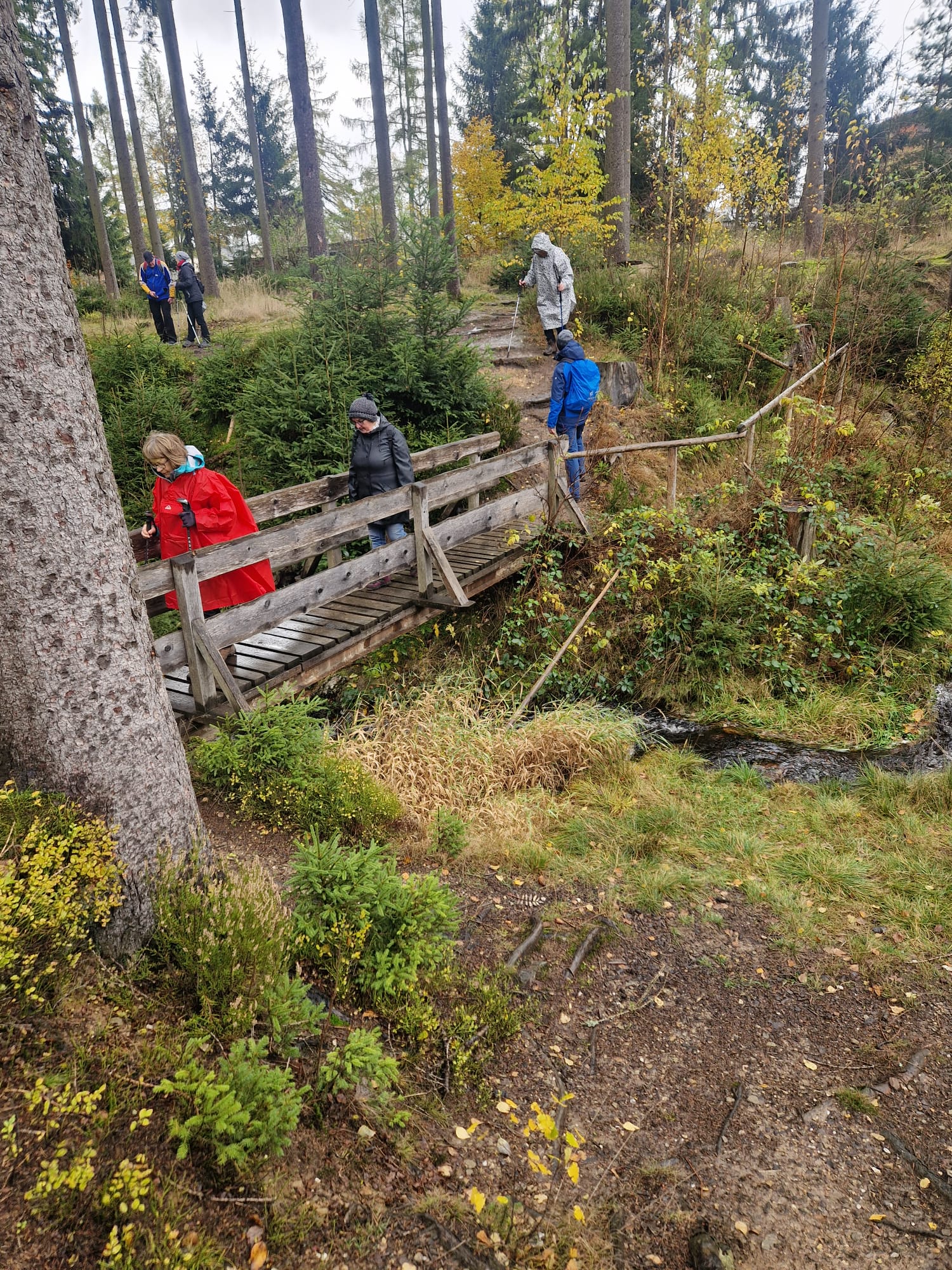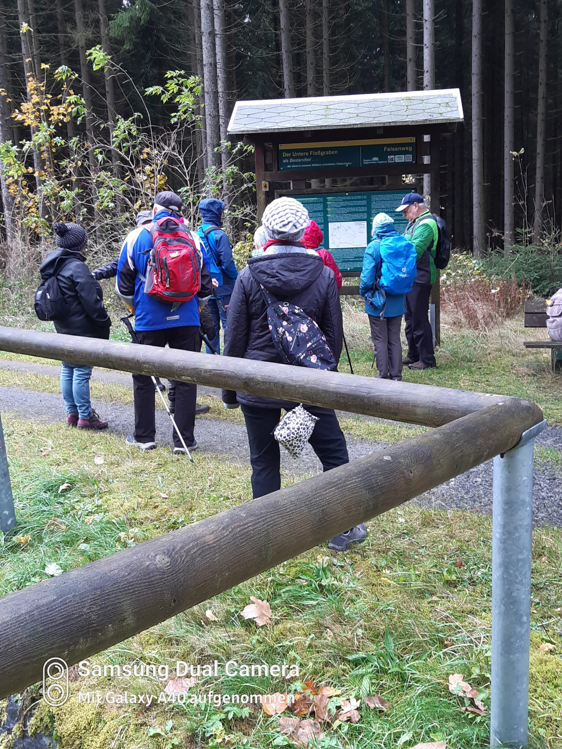 Durch das Naturschutzgebiet Muldenwiesen, entlang der Zwickauer Mulde bis Friedrichsgrün, begleitete uns leichter Nieselregen. Vorbei an der Firma Seidel nahmen wir über den Lehmgrubenweg das Naturschutzgebiet Am Alten Floßgraben als 2. Teil des neu gestalteten Moorlehrpfades unter das nötige feste Schuhwerk. Auf einem wunderbaren Waldweg erreichten wir den Unterstand am Alten Floßgraben zur ersten Rast. Die eigentlich schöne Aussicht versperrte lediglich ein dichter Vorhang eines kurzen Regengusses, den alle jedoch unbeschadet überstanden. Der alte Floßgraben begleitete uns ein weiteres Teilstück unseres Weges und Infotafeln vermittelten umfangreiches Wissen zu 300 Jahren Flößerei im Vogtland. Wir querten dann die Falkensteiner Straße um im Schutze des Waldrandes dem nächsten Guss zu entgehen und gelangten zum Rastplatz am Fuße der Rißfälle zwischen Hammerbrücke und Grünbach. Hier endete das heutige Naturdenkmal „Oberer Floßgraben“ mit künstlich in den Fels gehauenen Kaskaden zur Überbrückung eines Höhenunterschiedes zwischen Floßgraben und der weiterführenden Weißen Göltzsch. Über Elster und Saale gelangte das Scheitholz damals bis Leipzig und Halle. Der einzige Wasserfall im Vogtland zeigte sich von seiner wasserreichen Seite und vermittelte bleibende Eindrücke von der Vielfältigkeit und Schönheit unserer Wandergebiete. Vorbei an der Bauernschänke ging es zurück zum Parkplatz. Die Einkehr in den Flößerstuben in Muldenberg wurde zum erfolgreichen Abschluss unserer 8 km Tour. Danke dem Gaststättenteam für leckeres Essen und angenehme Gastfreundlichkeit.